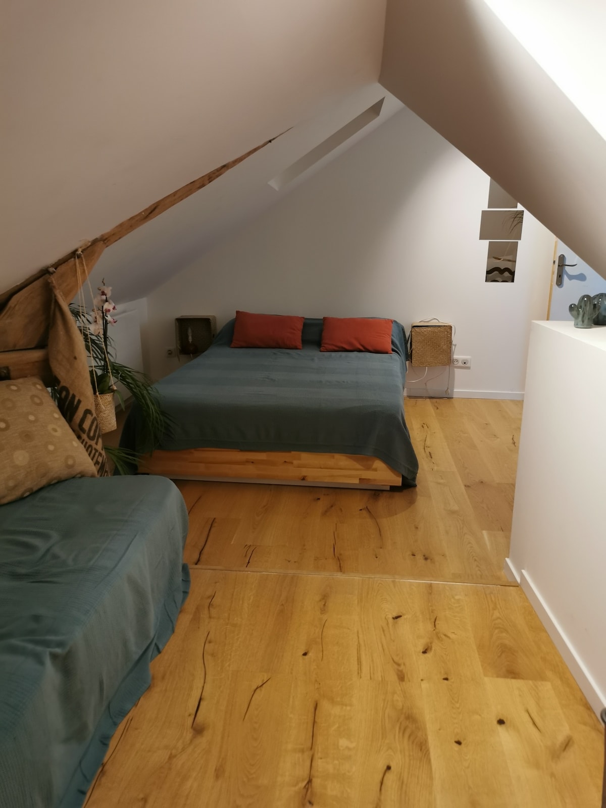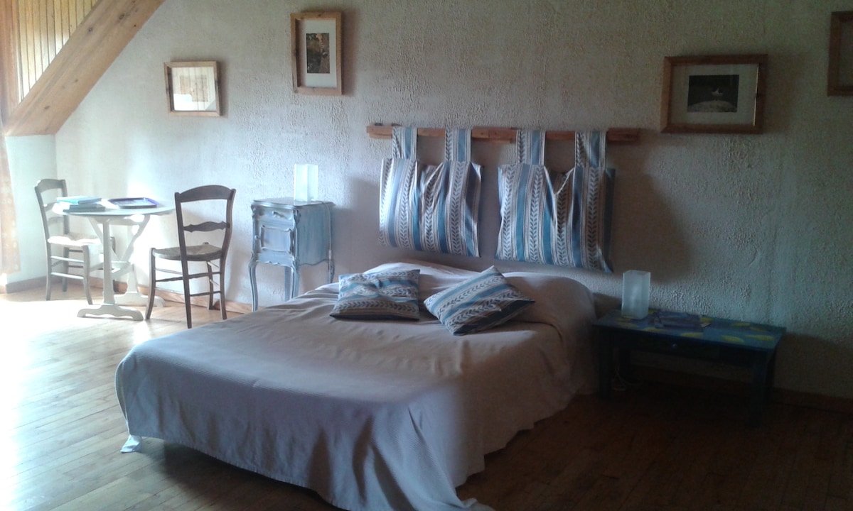 Laissez-vous séduire par cet adorable hébergement. Dans une grande maison ancienne, chambre privée de 20m² au sol ( sous les combles) , ventilateur. Jardin clos de 500m² arboré avec terrasse semi-ombragée par un eucalyptus. La maison accueille aussi un petit chien très gentil et très joueur.
