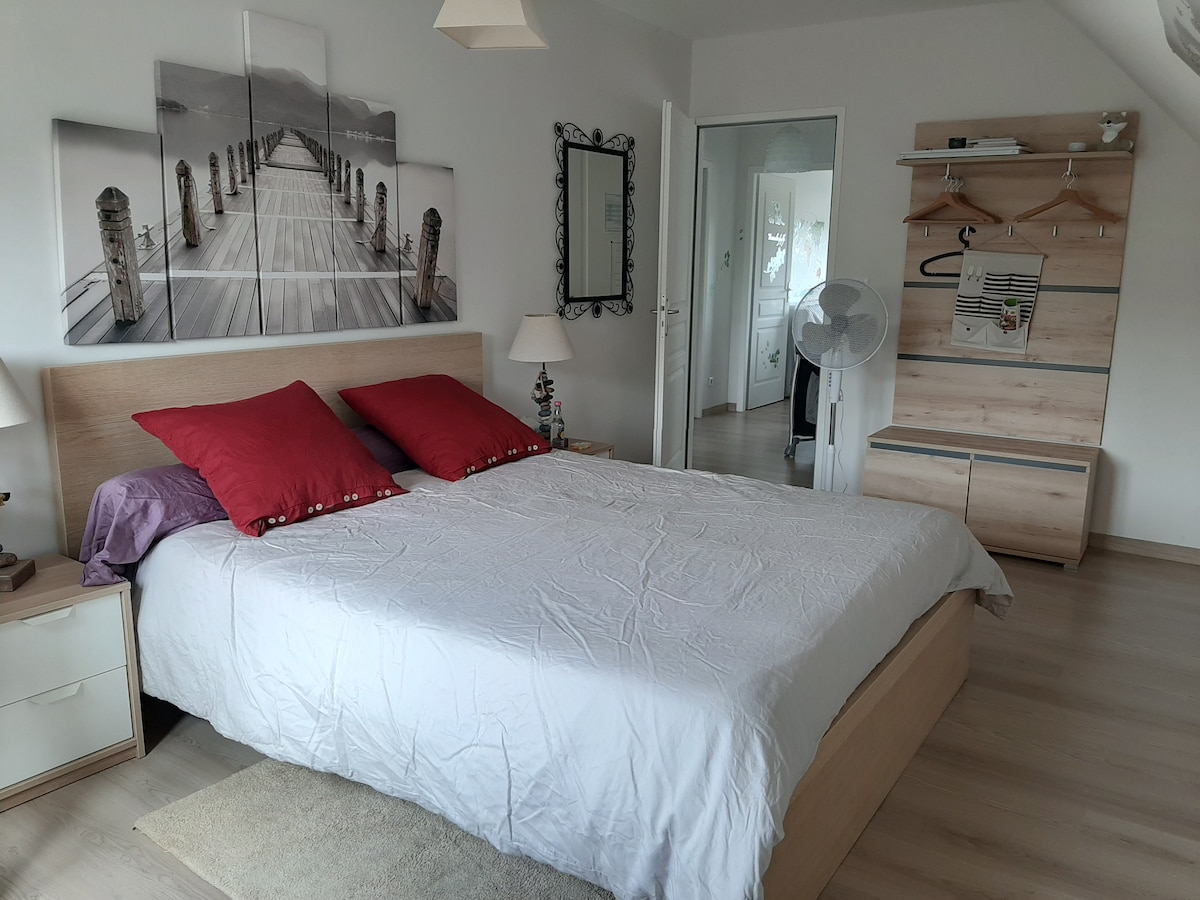 Laissez-vous séduire par cette chambre au 2ème étage d'une maison dans une résidence très calme. Coin bureau, wifi. Literie tout confort (140X200), salle de bain privative (douche, lavabo, WC). Maison non-fumeurs, située à 5 mn des bords de Loire (étape Loire à vélo), 10 min en bus du centre ville, 20 min de l'université. Parc Expo, Zenith et Com’met à 10 min. Commerces à 800m. Proximité des châteaux de la Loire. Stationnement privé, garage pour vélos. Petit dej et diner possibles sur demande.