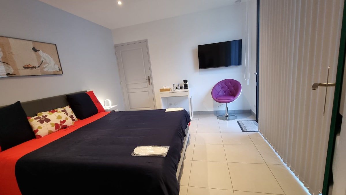Camille vous accueille dans ce charmant studio de 25m2 situé sur Saint Jean de Braye à 900m du tram B. Idéalement situé à 10 minutes du centre-ville d'Orléans. logement sans vis-à-vis composé d'une cuisine équipée avec lave vaisselle, micro-onde, frigo, plaque de cuisson, cafetière nespresso, bouilloire… Une chambre avec lit 160x200, tv, dressing, douche à l'italienne. Les draps et serviettes de bain sont fournis. Jardinet devant le logement. Parking extérieur ou dans la cour si besoin.