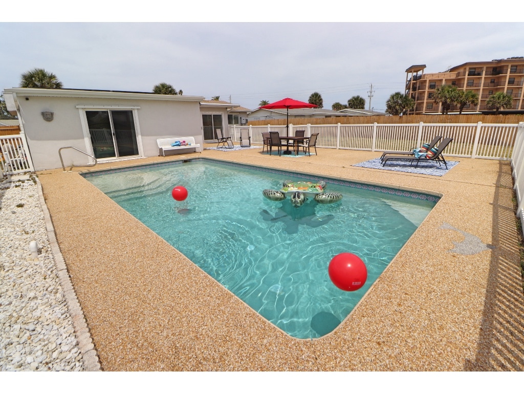 Costal beach home 200ft. from pristine no-drive beach.. close to grocery, restaurants and entertainment. Large pool deck with new pavers. 2 sun loungers have been added along with fresh landscaping. Large swimming pool. Located on a quiet street, this 2BR/2 BA home is the perfect location to relax & live like a local. Perfect for families & friends, this place is fully stocked and ready for your arrival, just bring your swimsuit, flops & sunglasses.