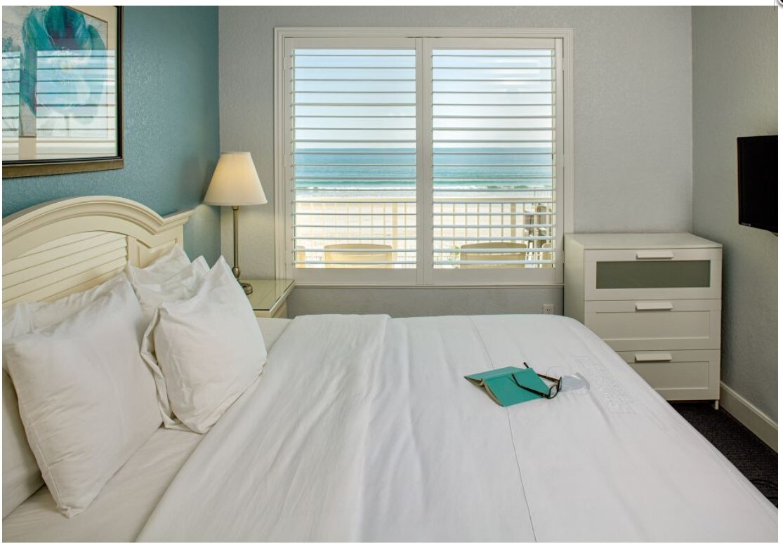 Charming and stylish studio, Queen size bed. 2 burner kitchenette. Spacious bathroom with supplies. This location is on Daytona beach, close to Ormond Beach. Near by is fabulous shopping, dining, and entertainment. The Studio faces the ocean. This is a direct ocean front studio. Indoor & outdoor north pool are currently open. Sauna and gym are open. We have beach access to the north side of the building via the public access ramp. Temp parking is next door, south side behind white fence.