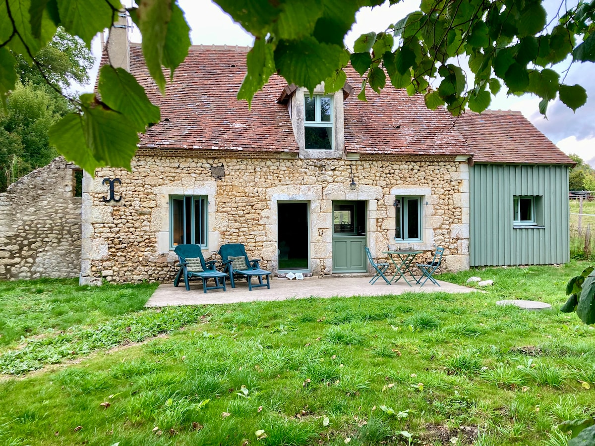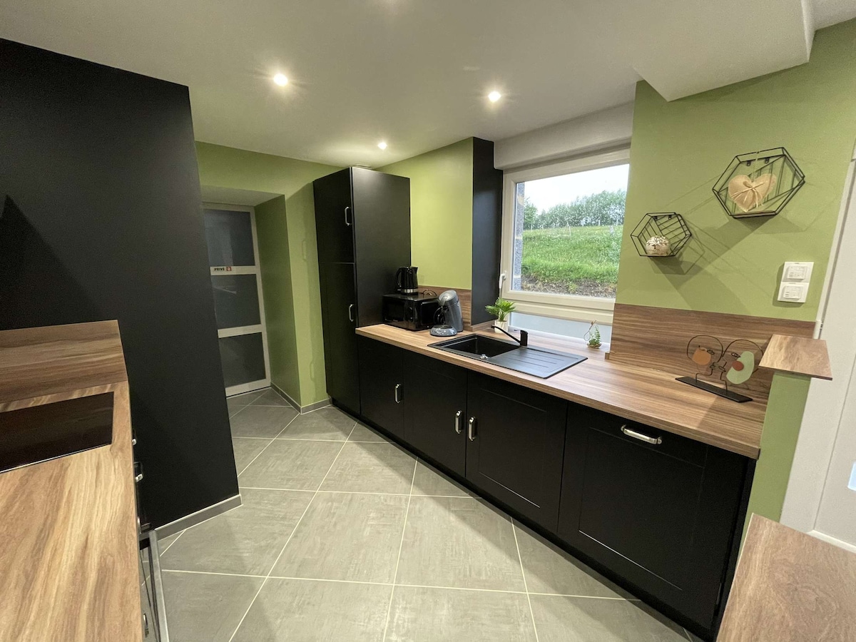 Cosy, completely renovated and fully furnished small house. Living room with pellet stove and fully equipped kitchen. 2 large bedrooms and a bathroom upstairs. Terrace, large garden and orchard with sheep! Ideal for a week-end in couple and with your family or for remote work: equipped with desk and 2nd screen, wifi everywhere in the house. Nature will be all around you. Nearby: the countryside and the forest