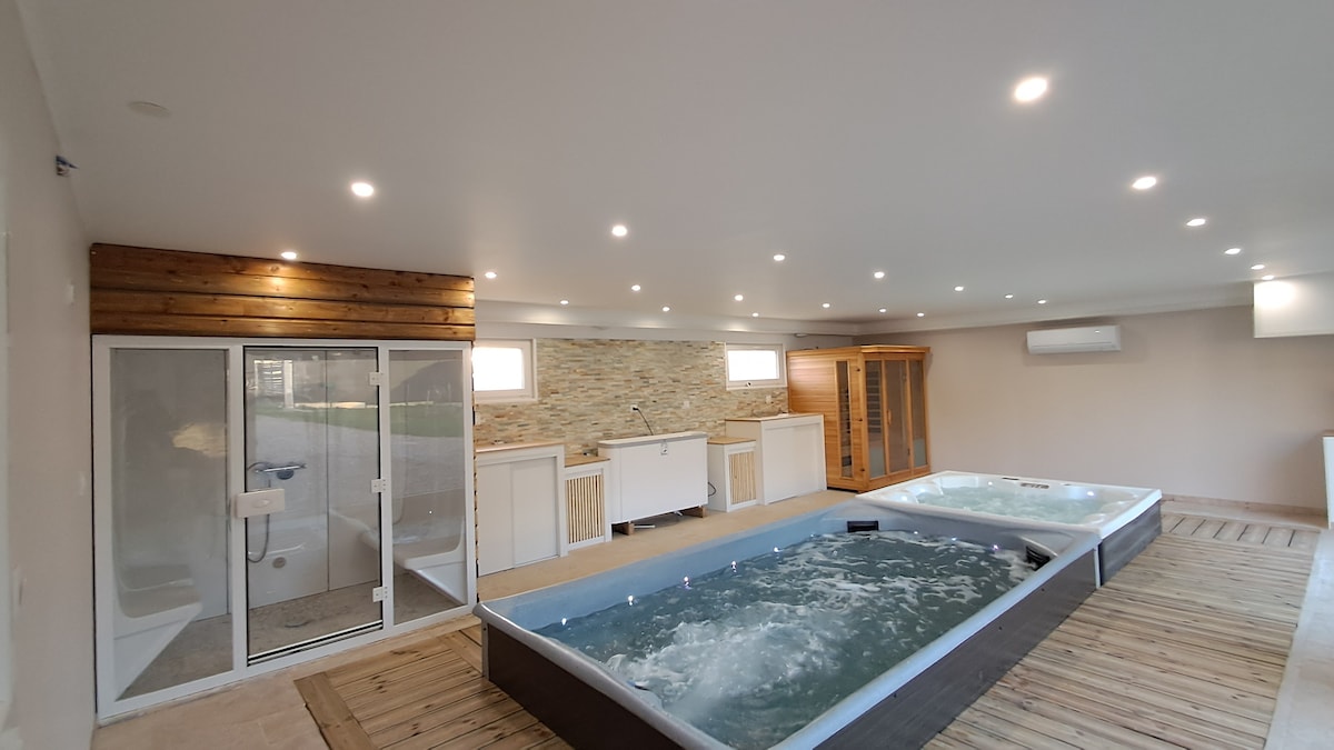 Le Gîte vous propose un hébergement avec une piscine intérieur chauffée, une cabine de sauna et un jacuzzi 5 places ainsi qu'une salle de sport. La maison comprend à l'étage 1 suite parentale avec salle de bain comprenant une baignoire balnéo, un salon cosy équipé d'un canapé lit et au rdc, 1 grande chambre avec 1 lit double et 1 canapé lit, 1 sdb avec douche à l'italienne, 1 salle à manger avec 1 poêle à bois et une cuisine entièrement équipée. Les serviettes et linge de lit sont fournis.