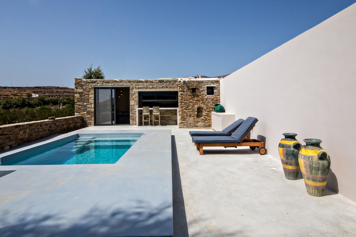 *THE POOL IS PRIVATE* This modern apartment has 2 bedrooms, 2 bathrooms and an outdoor private area with outstanding views of Mykonos, the Mediterranean Sea and Cycladic Islands. The interior was just renovated and everything is new. New apartment located 4 mins (walk) from Ornos Town & Beach and a 5 minute drive from Mykonos Town. 2 mins away (Walk) there is a bus stop taking you to Mykonos Town. Daily Cleaning included. Private swimming pool with panoramic sea views Private Parking
