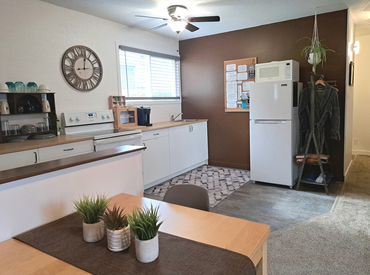 Quiet 2BR Suite • Kitchen, Workspace + Parking