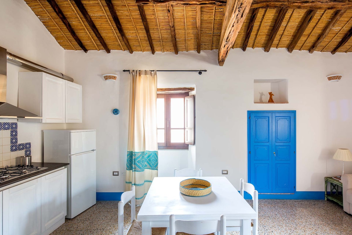 Casa azzurra e' stata ristrutturata secondo il modello delle antiche case sarde. Utilizzati legno di ginepro, canne di fiume, tegole in cotto, pavimento in cementine. Autonomo con ampia veranda ad uso esclusivo. Si compone di una stanza soggiorno con zona cucina. Piano cottura con cappa, forno elettrico, lavastoviglie, frigorifero. Stanza con letto matrimoniale, TV in camera. Ampio bagno. Lavatrice. Wi-fi. All'esterno è presente una doccia appartata ad uso esclusivo con acqua fredda e calda.