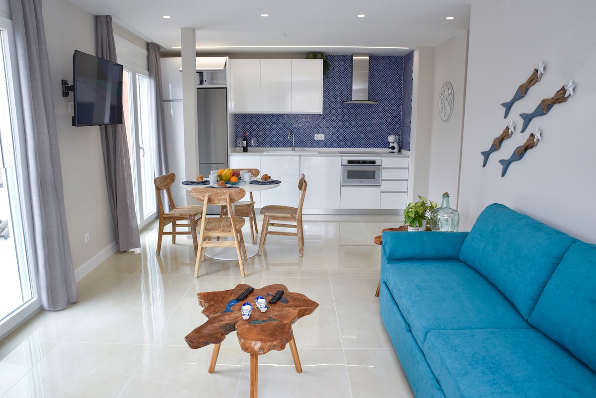 Wonderful 70 m2 attic with amazing panoramic views to the ocean, plus 30 m2 private solarium on the top. Nice ambient with special decoration. Ideal for couples or families of 4 people, although it can afford 6 using the bed sofa in the living room. It has two bedrooms, one looking to the sea and another one to the common gardens. A swimming pool is also available in the common areas. The complex is a quiet zone, no parties allowed. Sorry but no pets either.