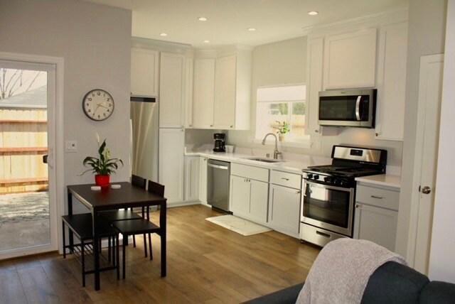 This cottage was completely remodeled in 2020. It sits on the back of our property and backs up to an orchard. The property is over an acre. It is quiet and peaceful. You will find fruit trees, grapes, a garden and chickens. The chickens roam the property during the day. You may hear a rooster in the AM. There is a covered patio and fire pit to enjoy the evenings in Chico. If you like to cook outdoors there is a gas BBQ & pellet grill/smoker. It is 1.8 miles from Chico State and Downtown.