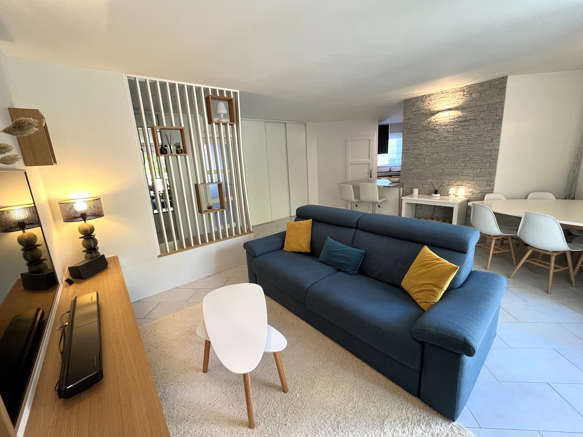 L'appartement indépendant au rez de jardin de notre maison située dans une rue non passante, offre un cadre paisible et reposant pour des séjours de tourisme ou d'affaire; Une grande terrasse ensoleillée pour des moments de détente et de repas en plein air avec barbecue disponible. La grande baie vitrée rend le séjour enluminé. Les fenêtres des chambres ont elles aussi une vue sur le jardin. Le jardin et la terrasse sont partagés avec les propriétaires. Famille calme, propre et rangée.