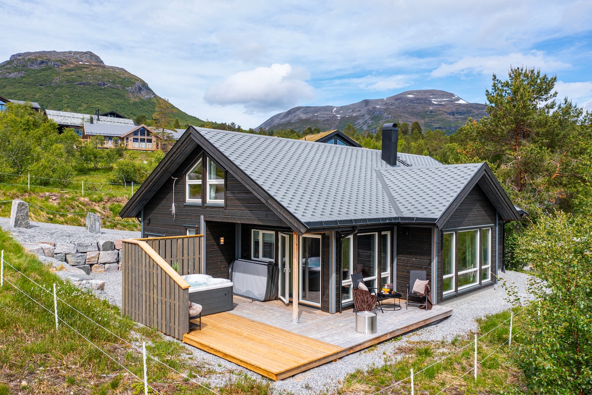 Ny og koselig hytte på Fjellsætra med jacuzzi. Nært skitrekket og langrennsløyper ved nydelige Sunnmørsalpene med fantastisk utsikt og natur. Du har mange fine turopplevelser både på sommer og vinter med kort vei til vann og skianlegg. Utestue og jacuzzi. På denne nye hytten kan du slappe av med hele familien, omgitt av fantastisk natur. Mulighet for å benytte liten robåt ved vannet. Kort vei til Stranda, Geiranger, Tafjord, Trollstigen, Loen, Ålesund og flere andre populære reisemål.