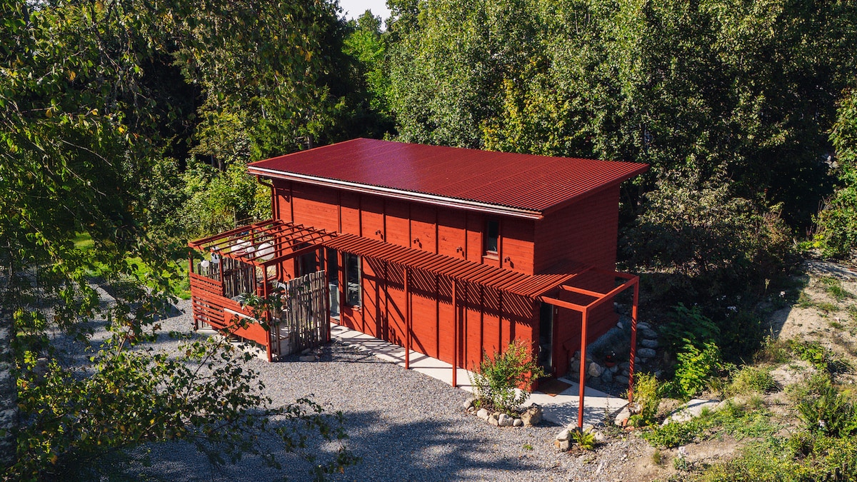 Featured in Airbnb Unique Stays - Three Cabins That Break the Mold Modern house with huge windows and balcony around the house. Great garden towards the forest. It feels like your in a treehouse when in the living room. - Sauna to rent in the garden. - 450 meters to the lake. - Climbing wall, trampoline and slackline in the backyard. - Great internet connection. Two bedrooms and a huge kitchen/living room with a fireplace. Perfect for 4-5 guests or a family who likes to cook, play and swim.