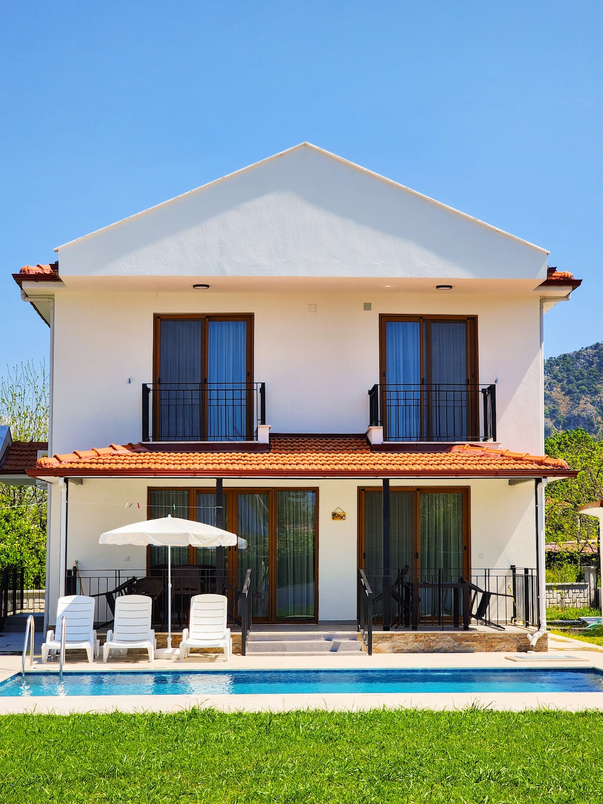 Özel Havuzlu, Girişinde meyve bahçesi olan Aileler ve arkadaş grupları için ideal, 2 yatak odalı konforlu dubleks villada her iki katta banyo, alt katta yatak odaları, üst katta salon ve mutfak bulunmaktadır. üst katta 16 m2'lik Deniz Manzaralı bir Balkon, alt katta 35 m2'lik güneşlenme terası ve verandası bulunmaktadır. Dalaman hava limanından araç ile 5 dakika uzaklıktadır.