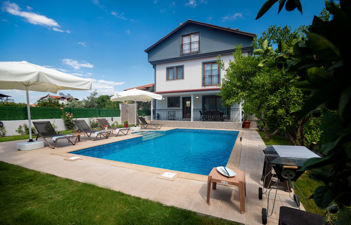 Merkezî bir konumda bulunan bu yerde kalırsanız ailece her yere yakın olacaksınız.Huzurlu, mutlu, stresten uzak bir ev. Havuzu ve bahçesi çok güzel. Bahçede barbekü(BBQ) olanağı var. Şezlong, şemsiye, ücretsiz internet ağı var. Teras ve güneşlenme imkanı var. Çarşıya yürüyerek 4 yada 5 dakika. Önünde oto park yeri var. Ön ve arka cephede toplam 2 tane balkono var. Mutfak malzemeleri kullanışlı. Tv, buzdolabı, ekmek kızartma, ketıl, fırın,... Var. Yatak odaları ve açık mutfakta klima var. ....