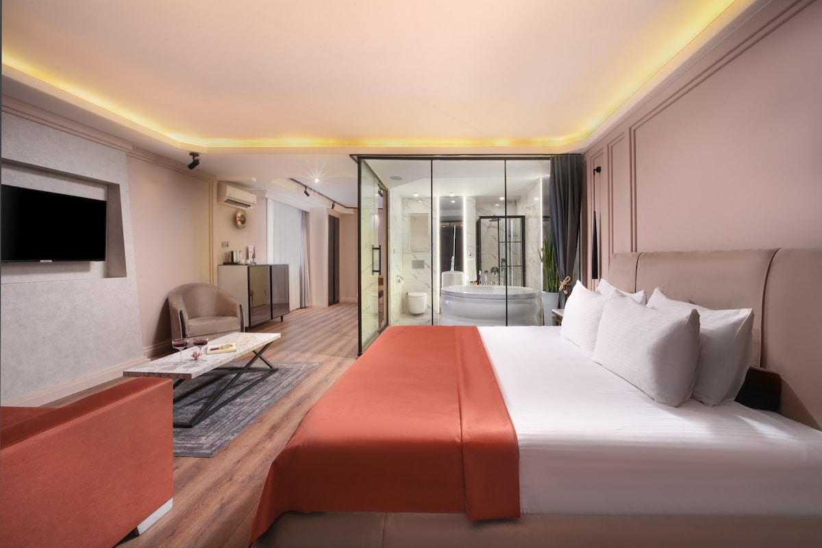 The location is unbeatable. You can see the old city walls of Topkapı Palace from your balcony. Famous Hagia Sophia is only stone’s trow away! The suite is 50 m2, there is 1 queen size bed, 1 portable bed(optional) and modern designed bathroom in the suit. This luxury suite is at the top floor of Sublime Porte Hotel.