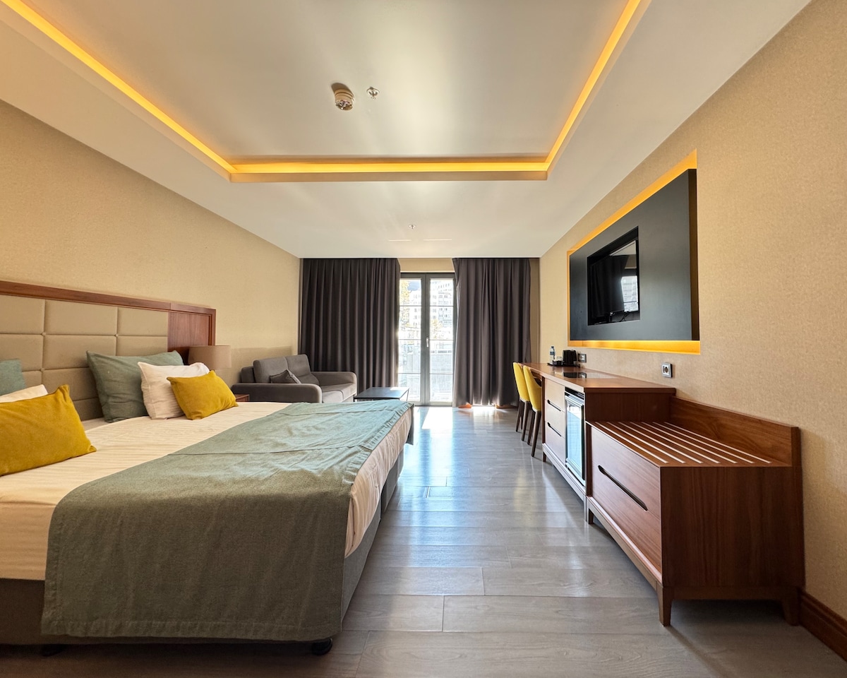 The location is unbeatable. You can see the old city walls of Topkapı Palace from your balcony. Famous Hagia Sophia is only stone’s trow away! The suite is 50 m2, there is 1 queen size bed, 1 portable bed(optional) and modern designed bathroom in the suit. This luxury suite is at the top floor of Sublime Porte Hotel.