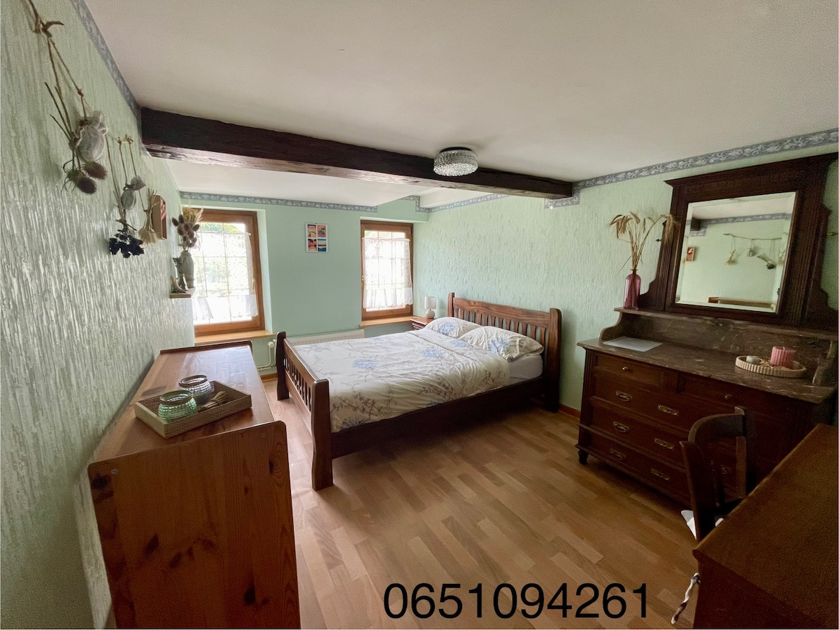 Bonjour, nous vous accueillons avec nos animaux dans notre maison située dans un petit village alsacien sur la route des vins. Vous disposerez d’un espace privatif de 40m² à l'étage, comprenant 1 chambre, 1 grande salle d'eau avec douche et WC ainsi qu’un petit salon avec table et chaises (coin détente ou pour prendre vos repas) dans la mezzanine ouverte au dessus de nos espaces privés Un micro-onde, de la vaisselle et une bouilloire sont à votre disposition dans la mezzanine