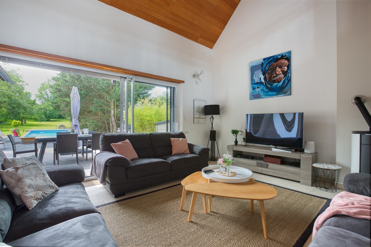 Bienvenue à La Maison Bas Lachamp Un lieu rare au cœur de la nature, parfait pour se retrouver entre amis ou en famille. 1 Suite, 5 chambres 3 salles de bain • Vue de rêve • Architecture exceptionnelle • Piscine intérieure avec nage à contre courant chauffée toute l’année • Sauna traditionnel • Baby-foot • Grande terrasse, hamac, brasero & barbecue • Cheminée centrale • Entourée de prairies, aucun vis à vis • Prestations haut de gamme • Animaux sur place, rando depuis la maison