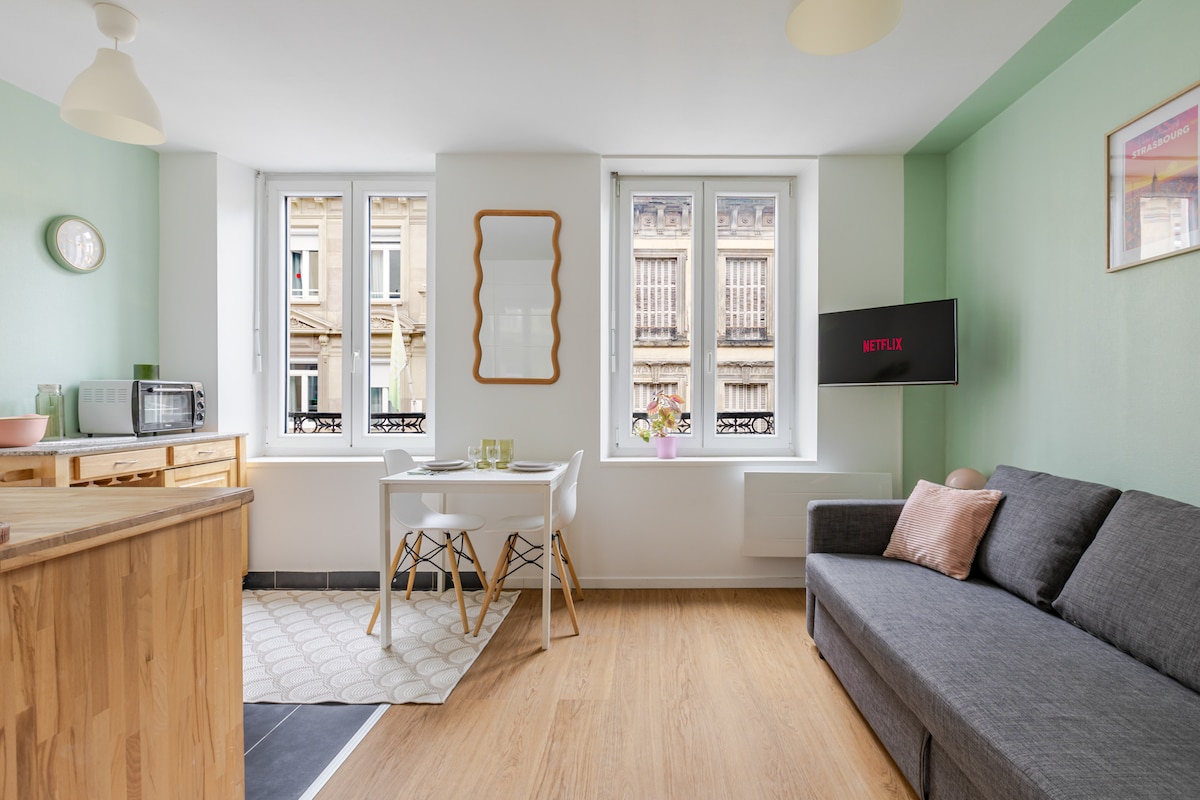 L’Écrin Beige – Découvrez ce spacieux T2 de 53m² avec balcon et sa vue imprenable sur les toits de Strasbourg, récemment rénové (2024). Au 5ᵉ étage avec ascenseur, cet appartement est très calme, lumineux et idéalement situé : à 8 min à pied de la Gare, 11 min de la Petite France et 15 min de la Cathédrale. Vous profiterez d’un emplacement central, proche des attractions touristiques, commerces, restaurants, supermarchés et tramway. Lit-parapluie pour bébé disponible sur demande.