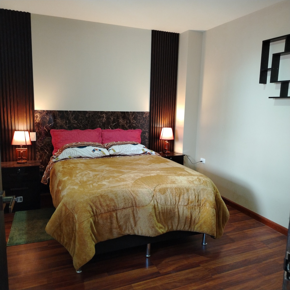 Ambientes amplios y dormitorios cómodos, confortable y equipados TV y calefacción en la sala, cocina completamente cocina, dos baños y el baño principal con tina/ducha con agua caliente las 24 horas. El edificio se encuentra a pocas cuadras de los Mercados Centrales Campero y Bolívar, hospital Cristo Rey, Multicines PLAZA y la Plaza Principal