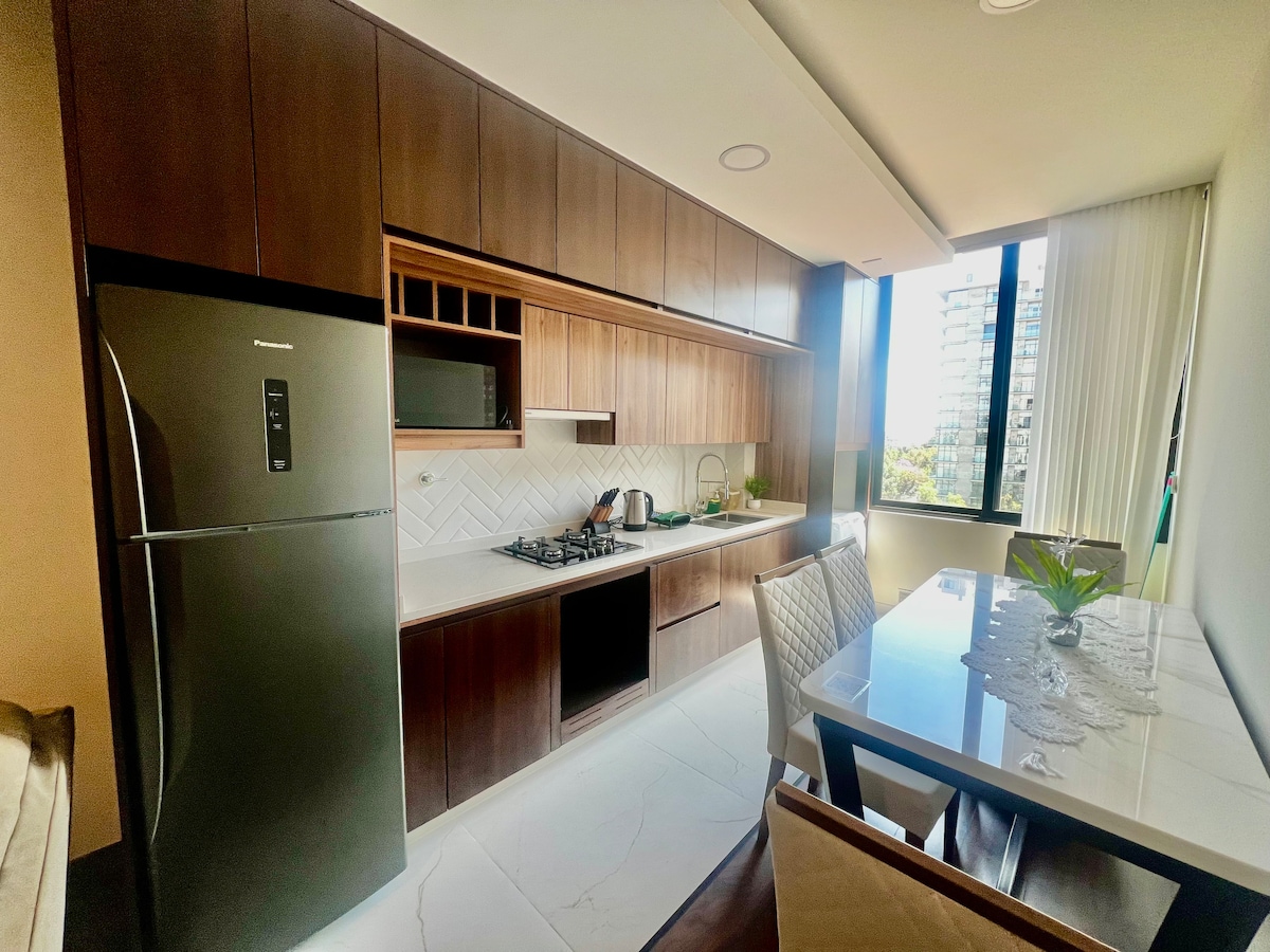 Exclusivo departamento de 1 habitación,ideal para parejas, viajeros de negocios o quienes buscan confort. Ubicado en una de las zonas más exclusivas y seguras de la ciudad, estarás a pasos de cafés, restaurantes, supermercados y centros comerciales Con habitación amplia con cama king. Cocina completamente equipada con refrigerador, microondas, cocina, lavadora Sala cómoda con sofá cama y Smart TV Piscina en la azotea con vista panorámica a la ciudad. Área de parrillero junto a la piscina70380815