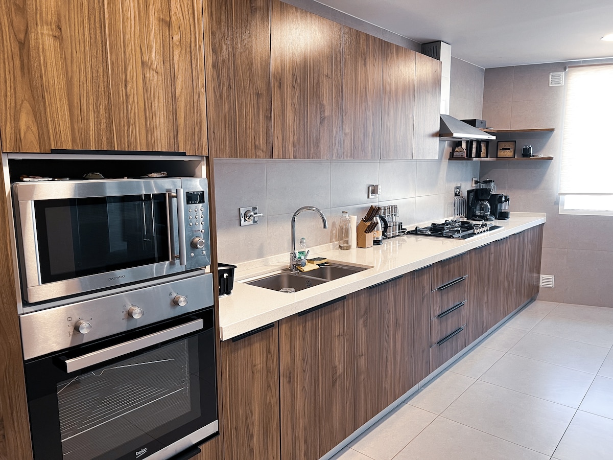 Departamento de lujo de 162m², con una fascinante vista a la ciudad. Totalmente nuevo, con acabados modernos y detalles que te harán sentir en casa. Podrás disfrutar de una suite con balcón y gran vestidor. Una habitación secundaria con un armario espacioso. Una cocina totalmente equipada y un living-comedor amplio. El departamento está cerca de supermercados, farmacias, bancos, cajeros, parques, restaurantes y lugares para salir a caminar.
