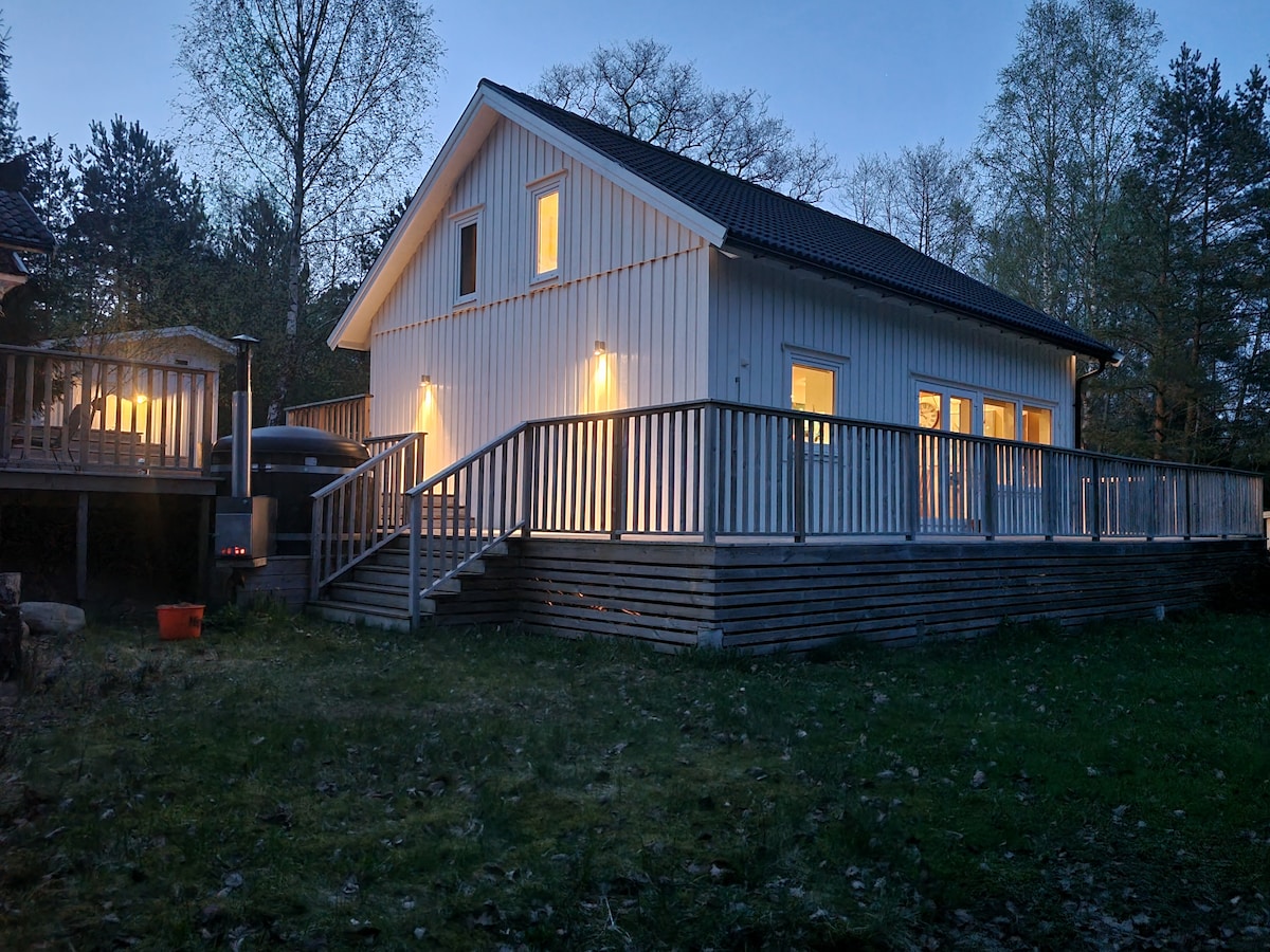 Nybyggd stuga alldeles vid havet med stor brygga och egen båtplats. På bryggan är det gjort för att man ska kunna njuta hela dagen, då det finns solstolar, badstege, utemöbler och grill. På gångavstånd kan man hyra kajaker, padelbanor och ett spa. Stugan har ett öppet vardagsrum och kök med fantastisk utsikt ut mot havet. Toalett med dusch och tvättmaskin. På övervåningen finns 3 sovrum. Ett med dubbelsäng och egen balkong, ett med 2 enkelsängar som går att ställa ihop och ett med en 120 säng.