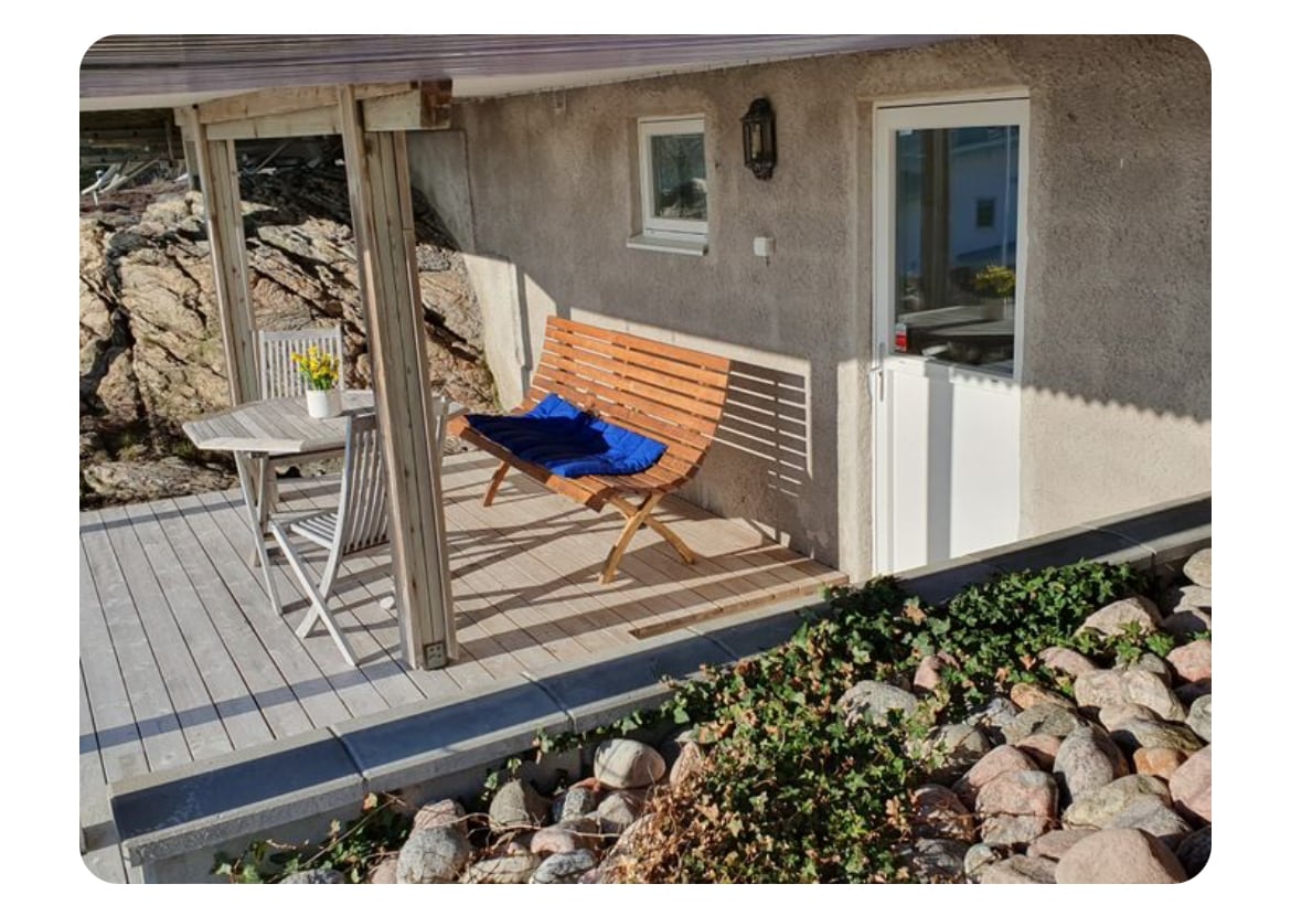 Stuga på 50kvm med egen strand & äldre standard. Ett sovrum, ett badrum med toalett och dusch samt tvättmaskin. Fullt utrustat kök med kyl och frys sam induktionshäll med ugn. Bäddsoffa i vardagsrummet. Matplatser för 6 personer både inne och ute på altanen som vetter mot havet. Gasolgrill, parasoll, tillgång till egen strand. Notera att det är ett par trappsteg ner till stranden (!) 3kajaker, 1 dubbel 2 singel och samt en liten båt finns att tillgå under vistelsen.Vedeldad badtunna finns