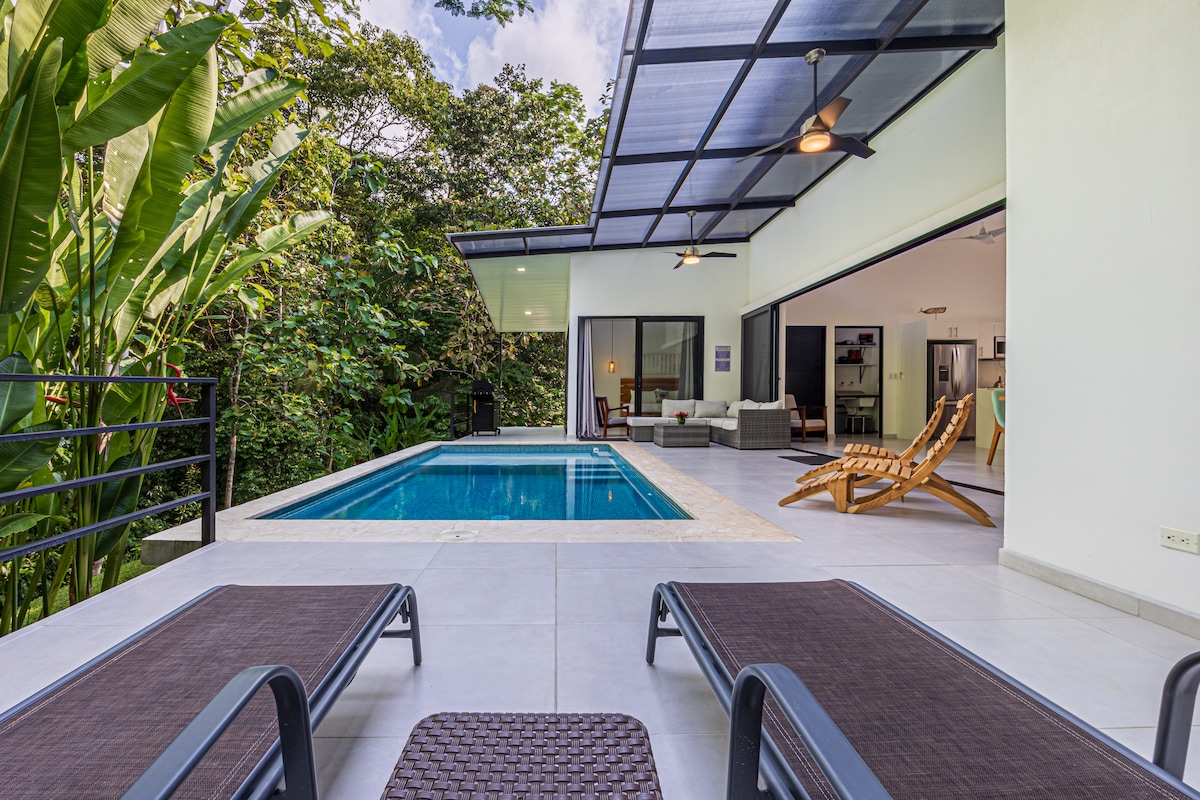 Nature oriented-modern beach house with large pool, 700m walk to the beach. Sip coffee, birdwatch, and indulge in a book on the spacious patio. After surfing or sandcastles, rinse off in the outdoor shower and swim in the pool. Hear the toucans and monkeys call from the tropical garden. There are spaces for everyone to gather and private desks in each bedroom. For the 3rd bedroom, choose 1 king or 2 twin beds. Walk to groceries and restaurants. Rainforest, beach, rejuvenation!