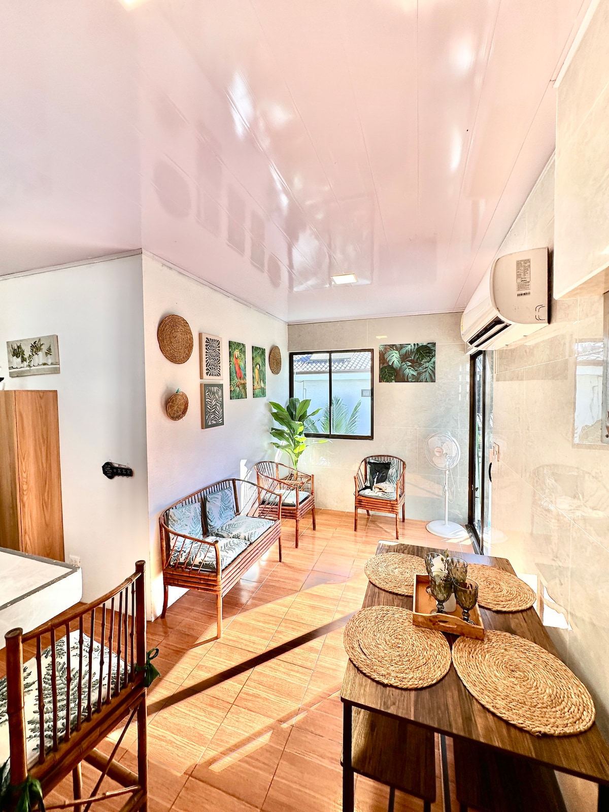 Modern designer studio in Uvita, surrounded by nature and natural light. Features high wood ceilings, a fully equipped kitchen, a comfortable king bed, and a private balcony. Contemporary finishes create a calm and stylish space. Located behind Mestizo Tradición & Fusion in a convenient area—perfect for relaxing, remote work, or exploring Uvita’s beaches, waterfalls, and jungle.