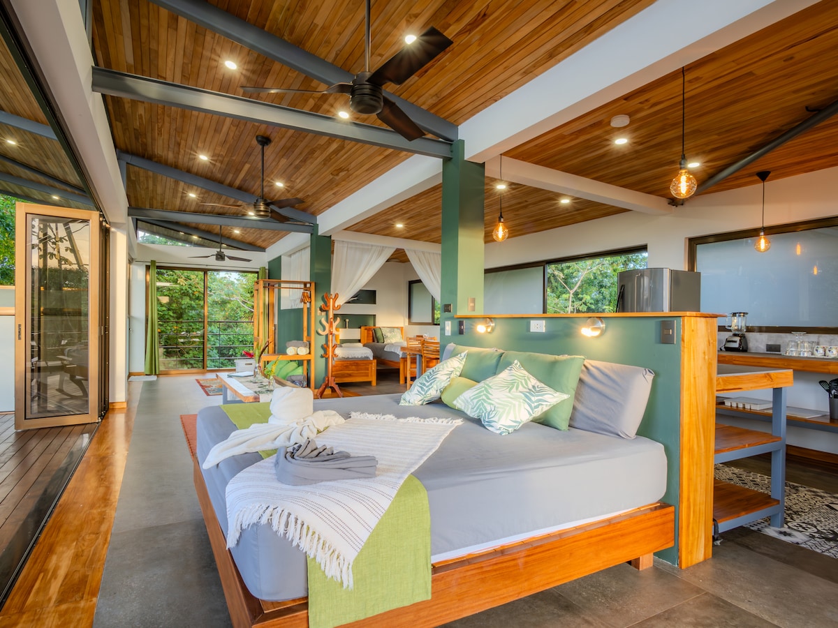 Escape to our Ocean View Suite at Villa Sueños De Bambu - a tranquil jungle retreat, just minutes from Marino Ballena National Park, restaurants, gorgeous beaches, & the towns of Uvita/Dominical. With views of the lush rainforest and the pacific ocean, enjoy comfort & natural beauty. Ideal for nature lovers, this serene escape offers easy access to waterfalls, wildlife, and adventure. Perfect for relaxing, exploring, or connecting with nature—don't miss your unforgettable Costa Rica getaway!