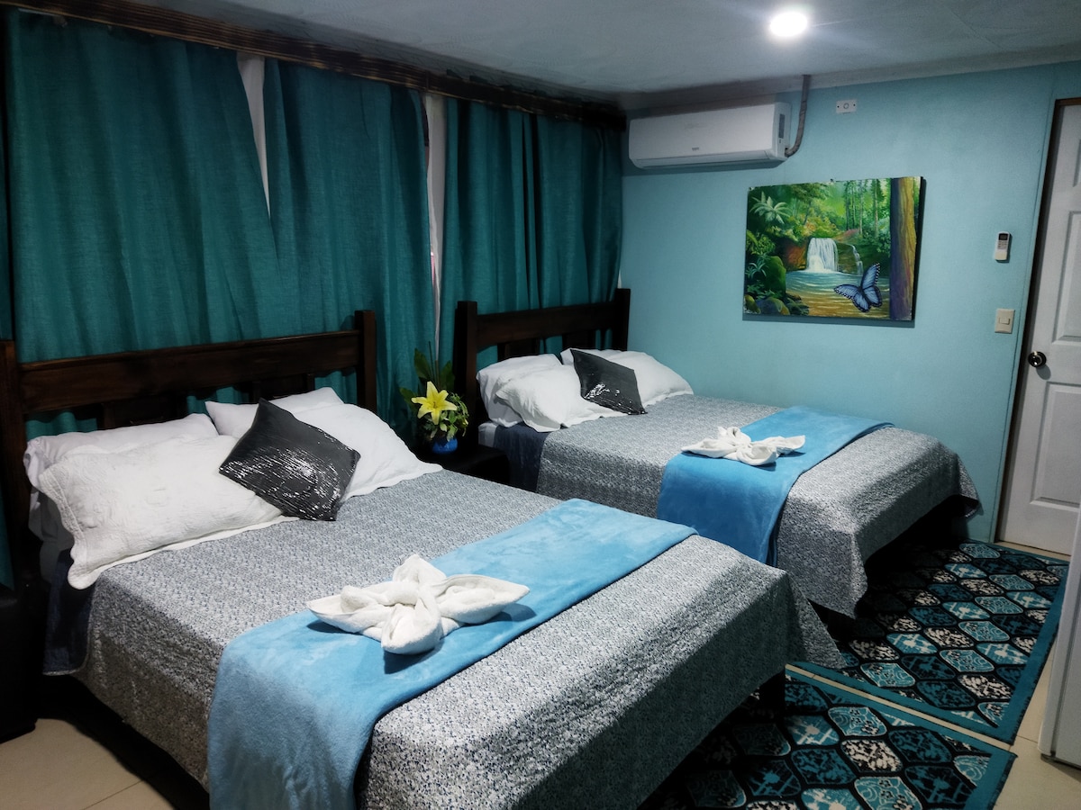 Arbol de Vida is small family owned Boutique Hotel in the Center of the downtown Puerto Jiménez. We have 5 unique rooms, all with double bed. Swimming pool and sun bathing chairs for you to enjoy. Great wifi and a yoga Shala. The Vegan Cafe will open later this year. Most of the rooms have private bathroom (one bathroom is shared as a quadrupled room, one bath is on the hallway) We are brand new, cute, comfortable and central!