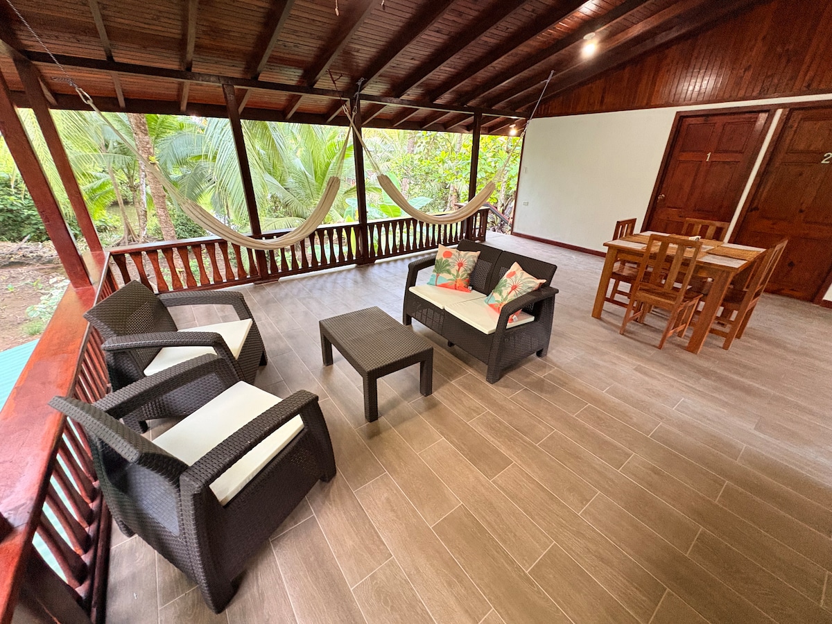 Enjoy this spacious- private Villa! located just minutes away from the amazing Golfo Dulce, heritage site for whales & dolphins. With its open concept, built right next to a garden lake; it is a perfect setting to relax and enjoy nature. Fruit trees and ornamentals attract birds, butterflies and monkeys. The large bedroom offers 2 queen size beds, A/C, a balcony, and an open concept bathroom. Brand new construction/ Gated with parking lot.