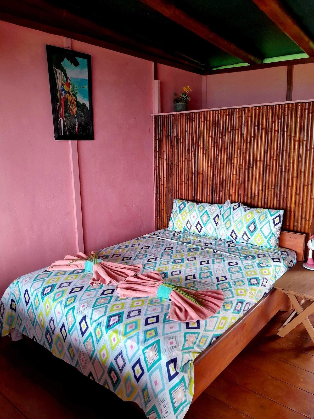 Bungalow totalmente equipado en medio del bosque tropical , a 15 minutos del centro de Quepos (( carretera-pavimento)) un lugar genial para los amantes de la naturaleza y quiénes le gusta la paz y tranquilidad que ella ofrece, muy buen lugar para el avistamiento de aves. Tiene capacidad para 3 personas, área de cocina equipada, sala de estar, cuarto privado , (WIFI), parqueo privado y piscina.
