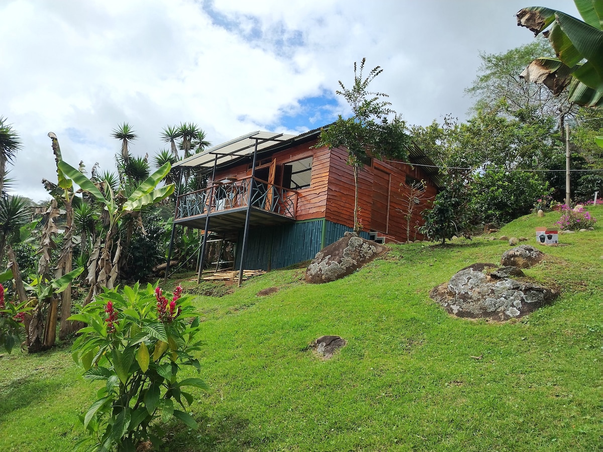 Cabaña rústica con pequeño balcón, cocina equipada, capacidad 4 personas en una sola habitación (1 cama matrimonial y 1 litera) 1 baño. Jardín donde se puede observar variedad de especies de aves y en época de lluvia diversas especies de ranas entre ella la Rana arborícola de ojos rojos. Barrio tranquilo.