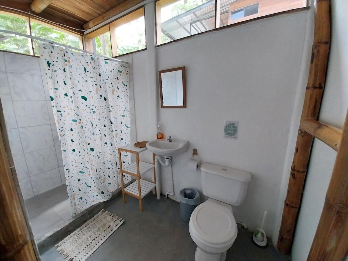 Conecta con la naturaleza de Uvita de Osa en este acogedor studio privado junto al bosque con vista al mar donde los amaneceres y atardeceres abrazan este tranquilo lugar. Localizado muy cerca de las playas, ríos, cascadas, restaurantes y todos los servicios. Disponible para dos personas, cama Queen, cuarto de baño privado, ducha con agua caliente, A/C, una pequeña refrigeradora, coffee maker, TV y WIFI. El parqueo es amplio, seguro y acceso privado con portón accionado a control remoto.