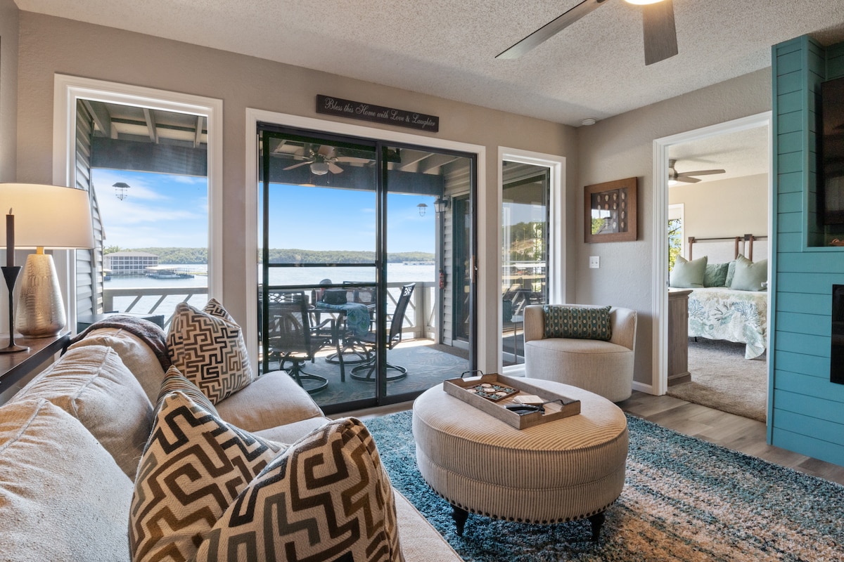 Lakefront*Unobstructed Views*Newly Remodeled*New Furnishings*Covered Patio*Electric Fireplace*Putting Green*65” Smart TV*King & Queen Size Beds*Updated Bathrooms*Easy Access/No Stairs* • Traveling with friends or need more room to spread out? We've got you covered. Just upstairs, we also host a separate 1-bedroom, 1-bath unit with its own shuffleboard, covered patio, and the same incredible lakefront views - perfect for a group trip while still enjoying your own space.