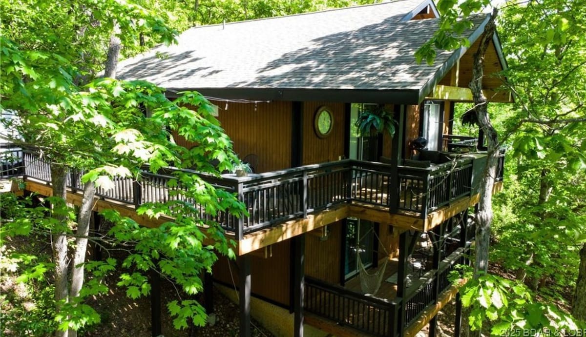 Rustic charm + Modern amenities. Our 1930's Cabin rests atop one of the most sought after view corridors at the lake. Over 100 feet above the water offering views of local Firework shows, gorgeous sunsets and a spectacular vantage point when there is activity on the lake. Nestled away in the wilderness, peaceful days and nights are many. Located in the heart of Osage Beach with nearby lake access at the state park, steak house adjacent to property and a wine bar.