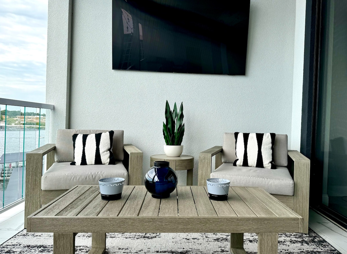 "This is IT!" 3mm Million Dollar Main Channel Panoramic View, Walk-in Level Entry, Two 58" Roku TV's, King Sized Bed, Electric Fireplace, Screened-in Deck, Electric Blackstone Griddle, Salt-water Pool, Deck Furniture, Papasan Lounger, Keurig Coffee, 400mbps WiFi... and a hammock! The perfect retreat for couples, but big enough for a small family... we'd love to host you at Lakescape Romantic Retreat! We believe our condo checks so many boxes that you'll say, just like we did, "This is IT!"