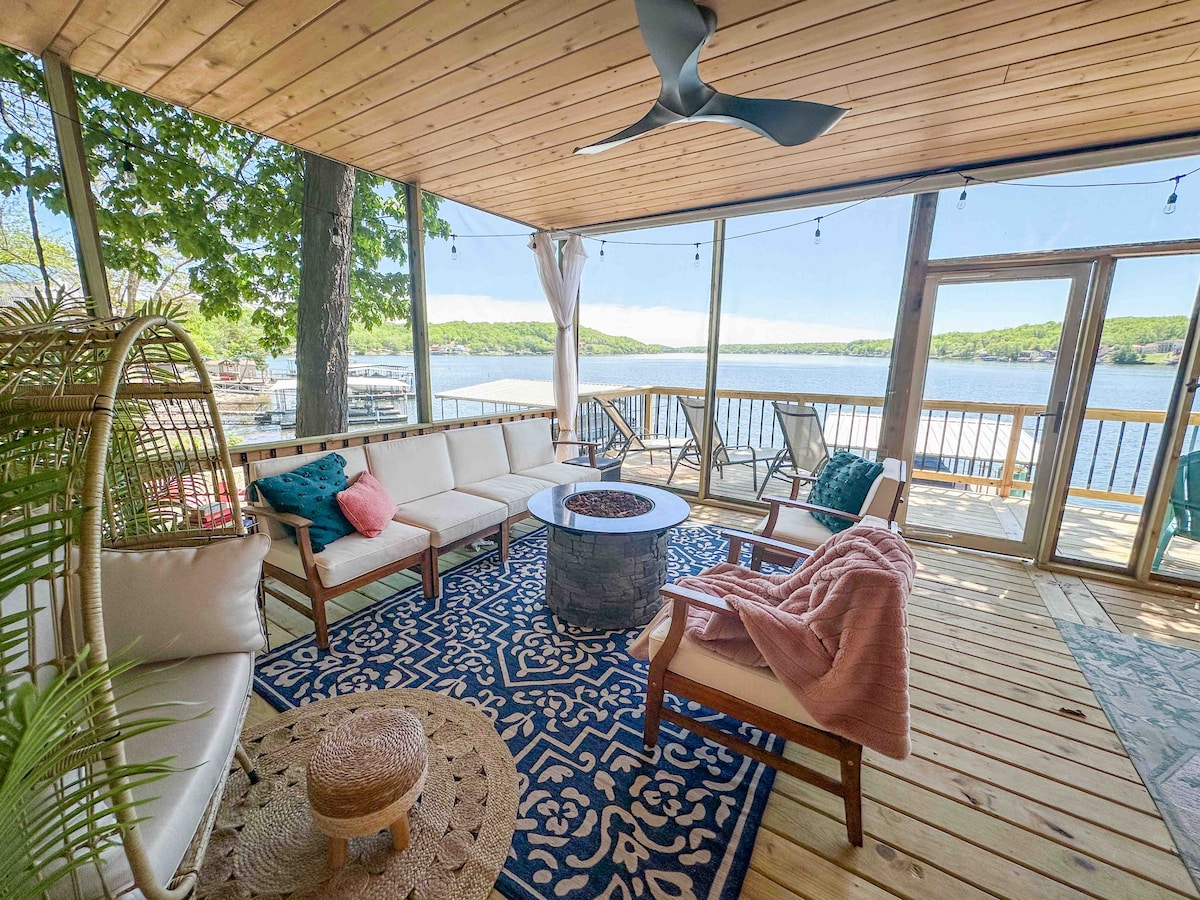 Lakefront home on MM29 at Lake of the Ozarks with flat lakefront! Family and pet friendly with private dock (swim deck + wet steps), 2 tandem kayaks, lily pad, life jackets, on paved road. Sleeps 12 in 4 bedrooms with 3 kings/3 queens (1 is a Murphy bed). Enjoy a large screened-in porch, equipped WFH setup w/ dual monitors, smart TVs, gas grill, and washer/dryer. Perfect for swimming, boating, fishing, or relaxing. Minutes by boat or land to dining, winery, & attractions. Book now for family fun