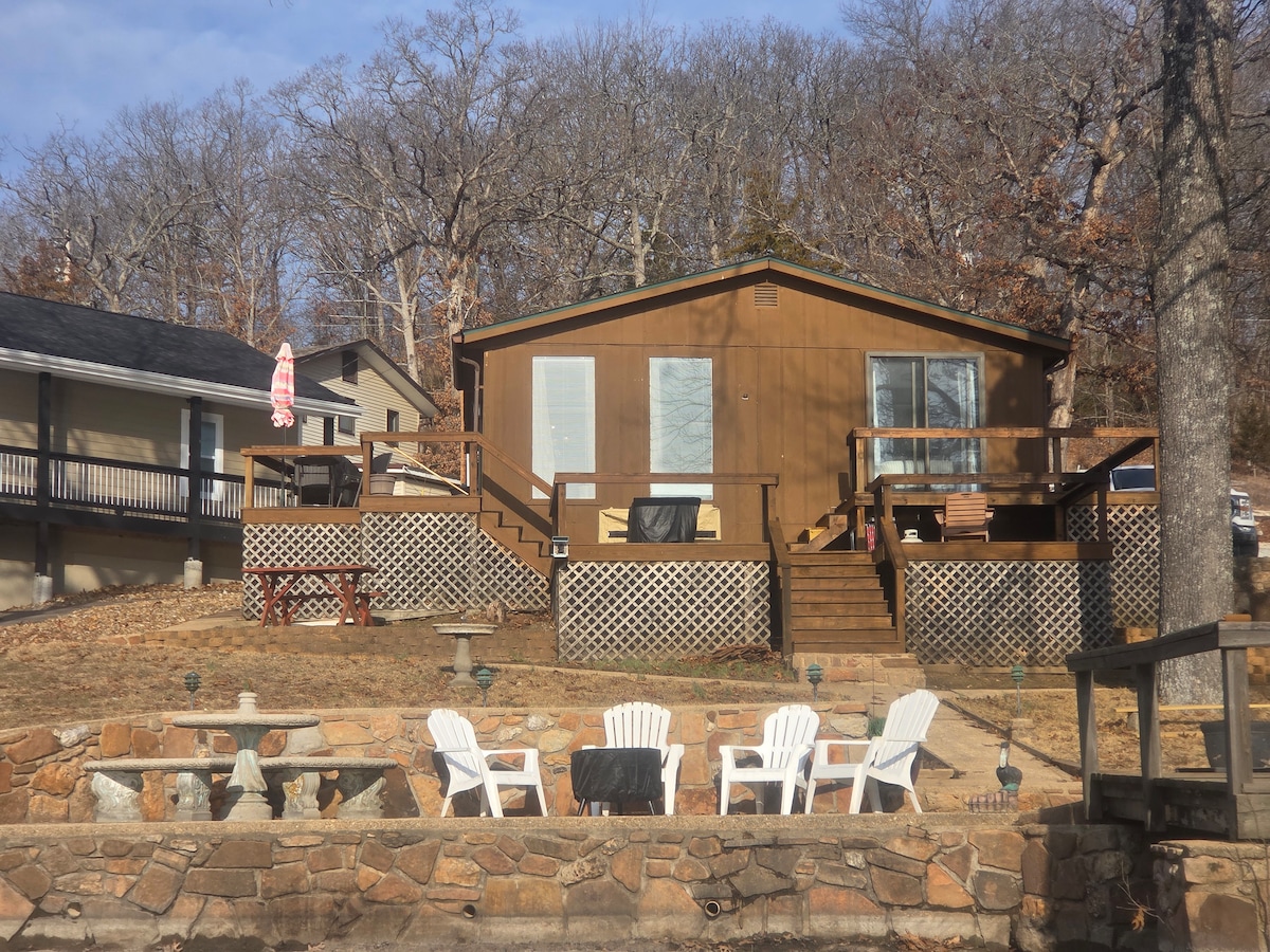 Welcome to Powell Lakehouse, a beautifully remodeled lakefront cottage in Buck Creek Cove at the 8-mile marker in Sunrise Beach, MO. This cozy 2BR/1BA home sleeps up to 5 and is perfect for a romantic getaway, anniversary, girls’ weekend, or small family escape—available year-round. Enjoy unobstructed lake views, a shared concrete dock, kayaks & paddleboards, a lakeside fire pit, an indoor wood-burning fireplace, and a fully stocked kitchen. Relax on the extended deck or covered patio, and soak