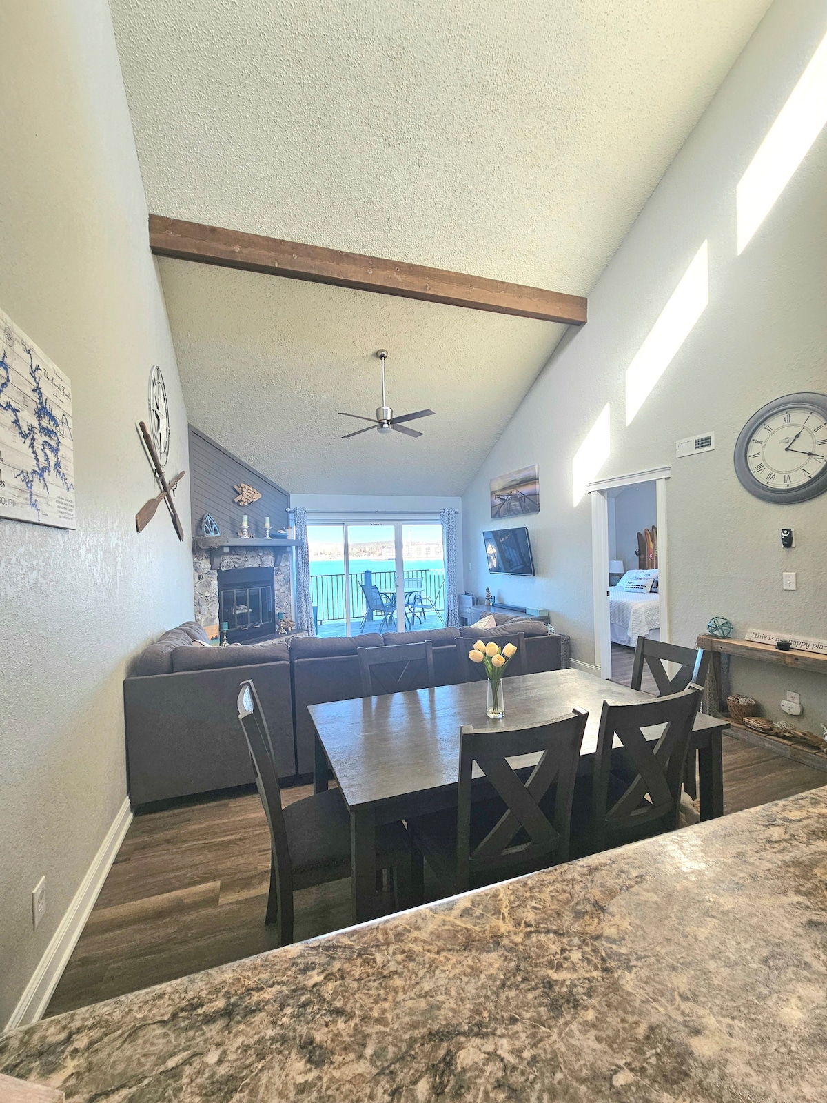 AMAZING VIEW lake front condo in Lake of the Ozarks. Relax in updated 2 bedroom condo (1 King Bed, 1 Queen Bed), 2 queen size sofa sleepers(accommodations for 6), kitchen updated in 2020 with all your needs, the fireplace makes it cozy for the cooler days! Condo is located close to famous Bagnall Dam Strip, shopping, and Restaurants. Condo is a great place to spend time with your family & friends swimming, boating, grilling, playing games, & fishing, the lake is just steps away. NO Pets!