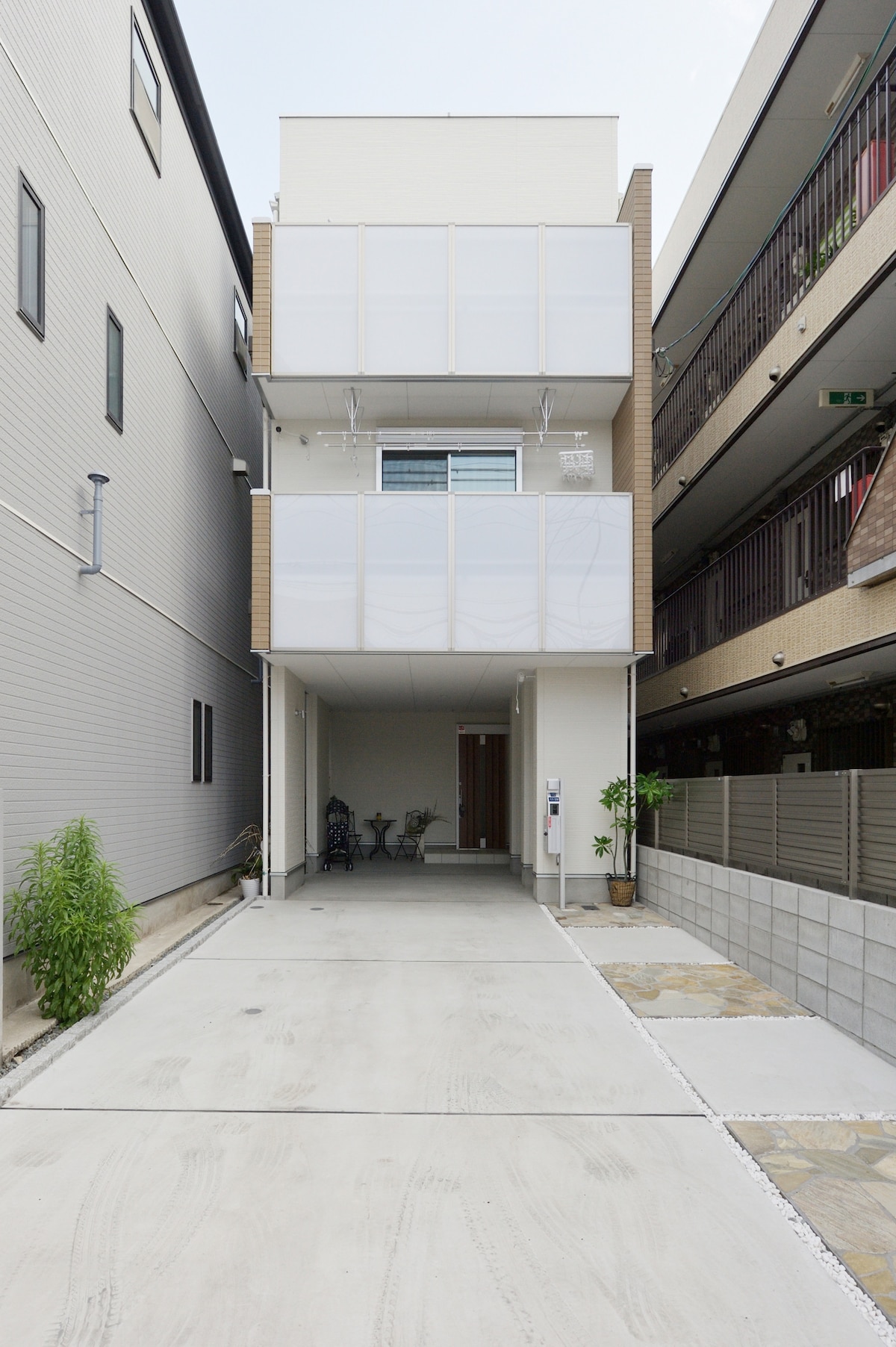 ★3 single futon(100cm x 200cm) ,1F ★2 single beds(90cm x 200cm), ★1 double bed(140cm x 200cm), ★1 double bed(140cm x 200cm),1single bed(90cm x 200cm), ★1 sofa bed(120cm x 200cm),living room space,2F ★Tengadjaya station is the nearest station(5mins on foot) ★Family mart(2mins on foot) ★Supermarket(5mins on foot) ★By train,Namba is 5 mins ★From Kansai airport:Take the Nankai railway train toTengadjaya station (about 40mins) 新築120平米 最大宿泊可能人数:8名 敷地内に無料駐車場(2台分)あり 対応言語:日本語・英語・中国語 最低宿泊日数:2泊以上