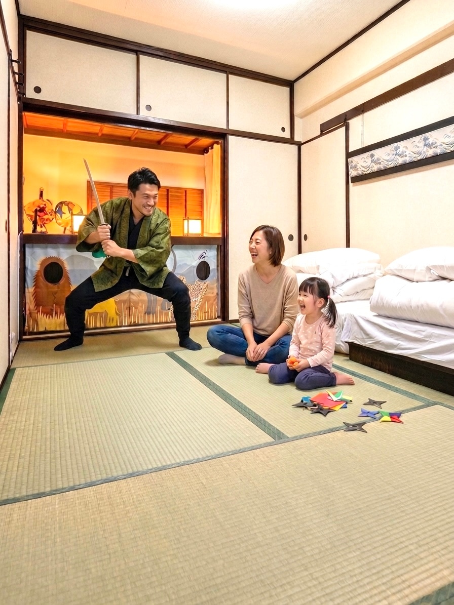 A stay where fun continues until checkout. Kishi Base 303 is not just a place to stay, but a place to experience Japan. Enjoy ninja toys,origami,and Japanese calligraphy. A secret base-like play space makes it perfect for families. Up to 7 guests (ideal for 4). 1 king bed (2 singles) + Japanese tatami room with double mattresses. 1 min walk to Station, 6 min to Namba. Easy access to Kyoto, Nara, and Kobe. Perfect for 3–7 night stays. A place to relax, where kids play and adults unwind.