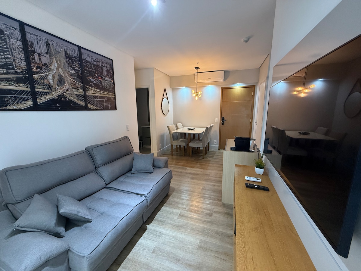 Excellent location in Osasco, SP. At 50m. from the Pinheiros and Tietê river, with easy access to the South and West zones of São Paulo. 10 min. from Osasco station and 9km from Alphaville. In the property you will find 1 bedroom and a large living room with 1 sofa bed, both with ceiling fan, SmartTV, 1 bathroom, equipped kitchen. Station with Wi-Fi 350MB. Cond. with 24-hour concierge, swimming pool, gym and pet place. Your small pet is accepted! Book in the best location in the city!