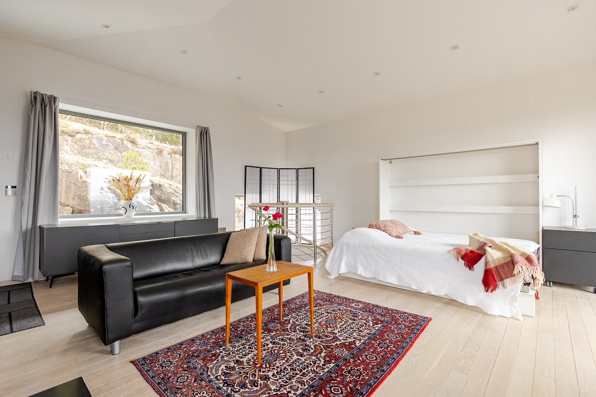 Nice bedroom with a good double bed and private bathroom. The room is attached to our main house where we live, but with a separate entrance from a small garden. Very central at Nesoddtangen. A one bedroom studio with a simple kitchenette in the same room. Calm neighborhood and close to ferry and beach. Nesoddtangen is an idyllic peninsula just outside Oslo, 24 minutes by ferry from the Town Hall. When you arrive at Nesodden you can bus or walk to our place. Clean and functional, but no luxury.