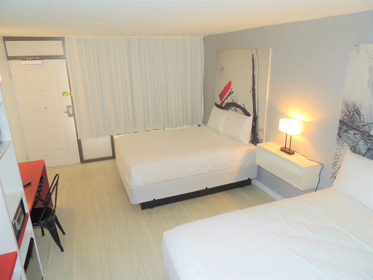 1-bedroom PRIVATE apartment suite with a full kitchen including all cookware/utensils, and 2 TVs in this suite in total. The room includes 3 full-sized beds. The bedroom has your choice of 2 full-sized beds or 1 King bed. Let us know after you confirm what you prefer. We also offer a great fitness center and guest laundry rooms so you can wash/dry clothing. You can pick up keys easily as our Front desk staff is on-site 24-hours per day and speaks English, Spanish, and Portuguese.