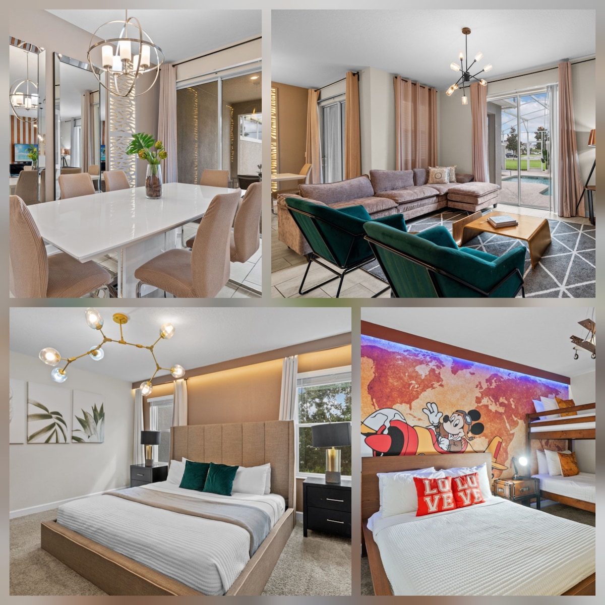 Relax in this LARGE FULLY RENOVATED LUXURY DESIGNER HOME in the famous REGAL OAKS RESORT w/ THEMED BR near DISNEY WORLD in ORLANDO FLORIDA! Enjoy the STUNNING LAKE FRONT VIEW, PRIVATE JACUZZI, NEW STYLISH FURNITURE, HEATED POOL, Waterslides, Poolside Bar, GAME ROOM, BILLIARD TABLES, Ping Pong, Restaurant, GYM, Tennis Court, and 24/7 Security Guard! - Walk 5 min to Old Town Amusement Park and World Food Trucks. - Drive 8 min to DISNEY, 20 min UNIVERSAL STUDIO, 15 min SEAWORLD and DISNEY SPRINGS