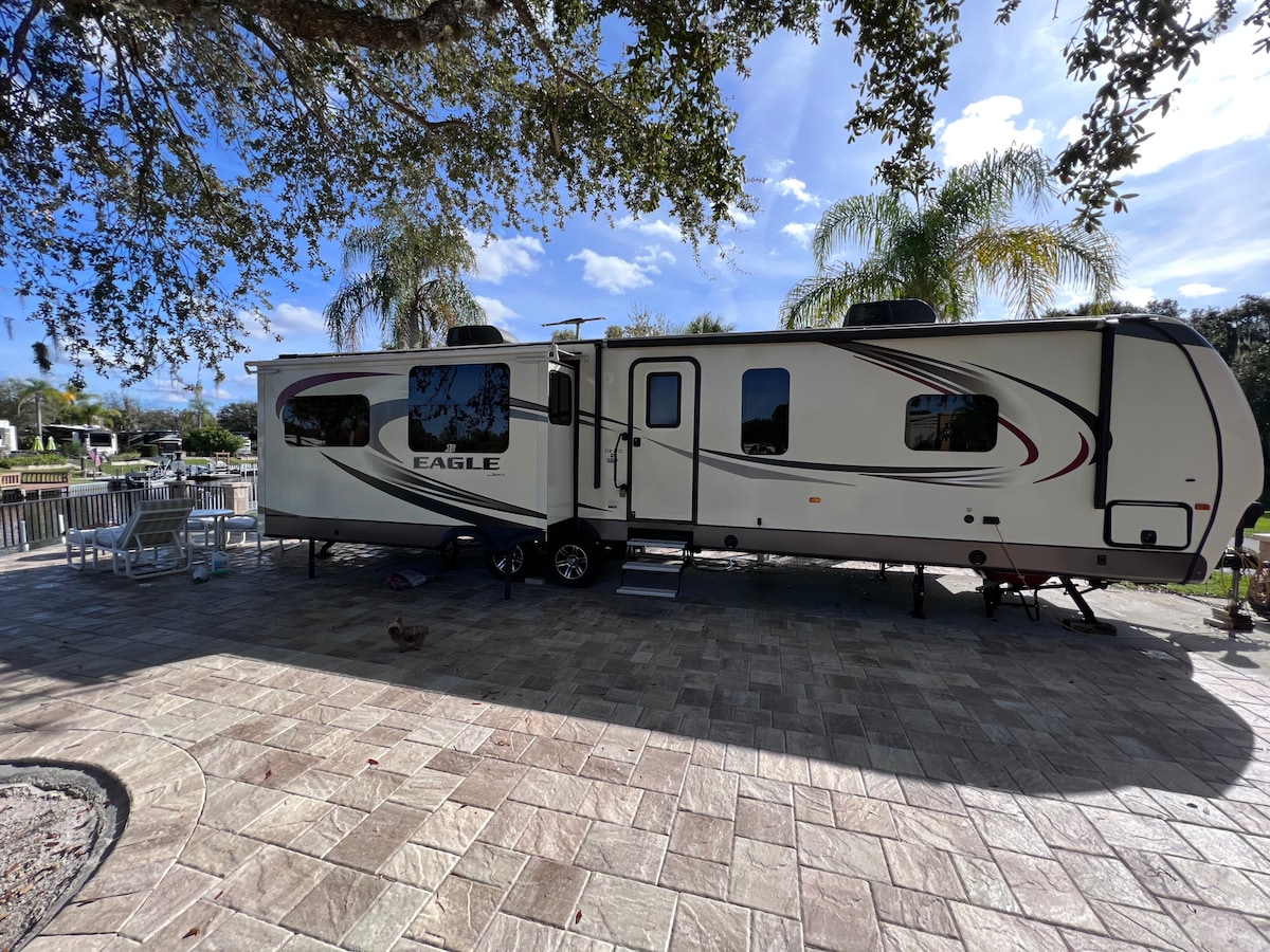 This cozy camper is located in a quaint small town. It is across from Lake Reedy which is a fishing lake and close to several more lakes. There are public boat ramps on the lakes. More than adequate boat parking on property. The property has a 4 ft deep pool, outside patio, gas grill, bikes and a fire pit. Centrally located between both coasts, Legoland, Disney, Universal, and Westgate River Ranch.