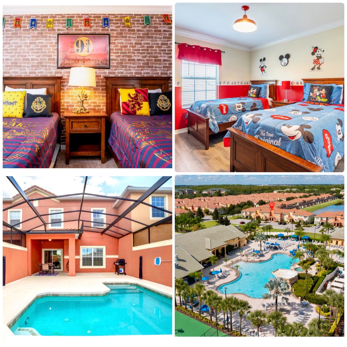 Looking for a spacious, elegant family vacation home close to the Disney Parks with all the amenities to make your stay as enjoyable and relaxing as possible? Then this is the place for you! This 4-bedroom 3-bathroom townhome is located right across the street from a top-of-the-line Clubhouse Complex, has a lake view, Harry Potter & Mickey themed rooms, and is only minutes to the theme parks! The townhome can sleep 8 guests and has its very own screened in splash pool for your personal use.