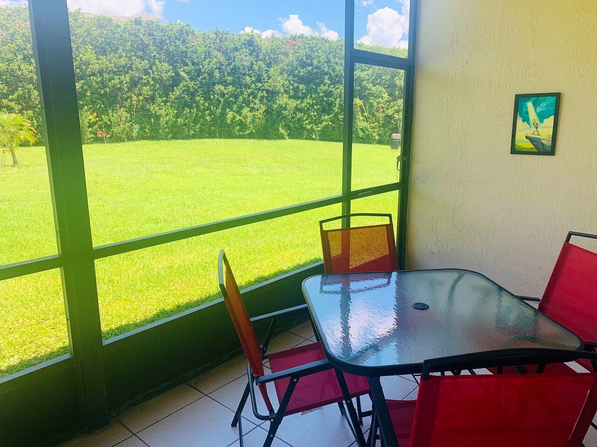 Quaint cottage with high-end appliances, perfect for business travelers or small families. Fully equipped kitchen. Lovely porch. Comfortable loving room with 2 recliners. A/C and 5 fans keep the unit cool! Full use of facilities: pools, gym, reception area, game room, miniature golf. 5 minutes from Disney, walking distance to Old Town. Why stay in a hotel when you can stay in Jubilee Cottage??